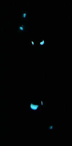 Its most distinguishing features are the cream-colored light organs underneath its eyes, which produce blue-green light likely used by the fish to attract prey, communicate with other fish, and frighten and confuse predators. These organs contain bioluminescent bacteria, fed by oxygen and nutrients from the fish's bloodstream,[6] which emit a constant light. The eyelight fish uses a black lid to cover the organs when it does not want to emit light.[5]