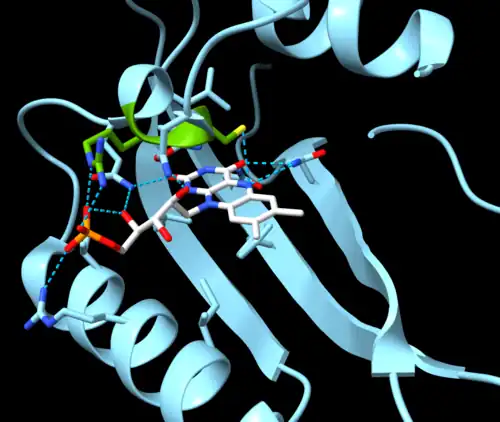 Phototropins have two distinct light, oxygen, or voltage regulated domains (LOV1, LOV2) that each bind flavin mononucleotide (FMN).[13] The FMN is noncovalently bound to a LOV domain in the dark, but becomes covalently linked upon exposure to suitable light.[13] The formation of the bond is reversible once light is no longer present.[13] The forward reaction with light is not dependent on temperature, though low temperatures give increased stability of the covalent linkage, leading to a slower reversal reaction.[13]