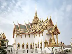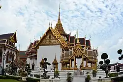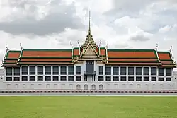 The Phra Maha Monthien (พระมหามณเฑียร) group of buildings are located roughly at the centre of the Middle Court, therefore at the very heart of the Grand Palace itself. The traditional Thai style building group is enclosed by a low wall, as this was once the residential and sleeping abode of kings.[29] Thus it is considered the most important set of throne halls in the entire Grand Palace. All of the buildings within the Maha Monthien face north and are arranged from front to back with the public reception hall being at the front, ceremonial halls in the middle and residential halls at the back, all of them inter-connected to each other.[9][30]