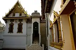 The Ho Phra That Monthien (หอพระธาตุมณเฑียร) is located to the west side of the Phaisan Thaksin Hall and is also connected by a corridor in symmetry to the Suralai Phiman on the other side. The Phra That Montein hall contains several small gilded pagodas containing the ashes of Royal ancestors. Originally named Ho Phra Chao, the name was changed by King Rama II, who installed several valuable and ancient Buddha images in 1812. King Rama III and King Rama IV also have their own Buddha images installed here and carried out extensive renovations to the interior and exterior.[36][56]