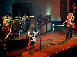 The group debuted several songs from Physical Graffiti live at a warm-up gig in Rotterdam, Netherlands, on 11 January, a week before the US tour, which lasted until 27 March.[51] The tour was also successful, and was followed up by a series of shows at Earl's Court, London. Tickets for the shows sold out within four hours, described by promoter Mel Bush as "unprecedented demand in the history of rock music", so a further two dates were added.[51] The shows attracted rave reviews, and critics noted the band enjoyed playing the new material on Physical Graffiti more than the older songs.[52]