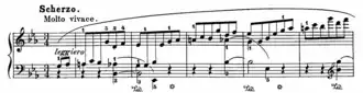 time. The movement opens with a "light-fingered moto perpetuo",[13] characterised by continuous quaver runs in the right hand[14] and minimal accompaniment[15] before "pivoting" to the trio in B major.[16] The trio consists of a more tranquil tune over a swinging accompaniment, reminiscent of Chopin's Scherzo No. 4, Op. 54.[17] Unlike the scherzo of the B-flat minor sonata and other pieces by Chopin with the title, it is exceptionally short, typically lasting barely three minutes in performance and serves as a brief interlude for the entire piece.[17]