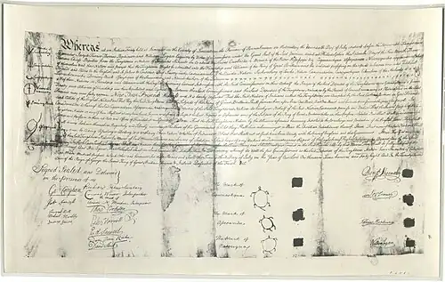 The next day the French flag was removed and the Ottawas were sent home. Gist and Croghan finalized a treaty of friendship with Memeskia: "We had Drawn Articles of Peace and Alliance between the English and the Wawaughtanneys and Pyankashees; the Indentures were signed and selad [sealed] and delivered on both sides."[22]: 11 Leaders of Pickawillany were invited to attend a conference at Logstown in May 1751, where Croghan distributed gifts and further cemented the relationship between the English and the Ohio Valley Indian communities.[2]
