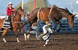 A pickup rider is a person on horseback who works at a rodeo in the rough stock competitions of bareback riding, saddle bronc riding, and bull riding.[1] Pickup riders play an important role in assisting rodeo riders and increasing the safety of competitors.