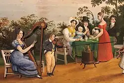 The Picture clock with Alster panorama (German: Bilderuhr mit Alsterpanorama), also known as the Coffeeparty on the Alster with view over Lombard Bridge to the city (German: Kaffeegesellschaft an der Alster mit Blick über Lombardsbrücke auf die Stadt), is a picture clock or music box painting (Spieluhr-Gemälde) – an oil painting of a landscape scene with integrated mechanical clock, automata and music box – that is in the collection of the Museum for Hamburg History.[1] 74 cm x 89 cm in size, it was made between 1827 and 1830 by an unknown group of artists and craftsmen.[2] It was restored in 2012 by the museum and watchmaker Helmut Tüxen.[3]