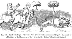 In India, pigsticking was popular among the Jatts, Gujjars, Rajputs, Sikhs, Maharajas, RajGond Rajas and with British officers during Victorian and Edwardian times.[1] According to the Encyclopædia Britannica Eleventh Edition, it was encouraged by military authorities as good training because "a startled or angry wild boar is ... a desperate fighter [and therefore] the pig-sticker must possess a good eye, a steady hand, a firm seat, a cool head and a courageous heart."[2]