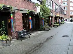 Newer buildings in the Market include the Post Alley Market at First and Pine (Bassetti Norton Metler, 1983), the Inn at the Market (Ibsen Nelson & Associates, 1985); and The Pike and Virginia Building (Olson/Walker, 1978); and the Market Heritage Center (Scot Carr & Thomas Schaer, 1999). All of these echo at aspects of the architecture of the historic Market buildings.[149] The Pike Street Hill Climb (Calvin and Gorasht, 1976) connects the Market to the waterfront; it occupies the same corridor that once (roughly 1911–1935[150]) held a wooden overpass used by farmers to bring produce up to the Market after arriving by boat.[151]
