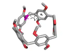 The orientation of the hydroquinone oxygens on both rims of the pillararene allow the macrocycle to exhibit planar chirality. When the substituent on the hydroquinone oxygen is small enough to fit through the cavity of the pillararene, allowing for oxygen-through-the-annulus rotation to occur, racemization occurs. If this substituent is large enough to prevent rotation, optically active pillararene macrocycles can be isolated.[7][8]