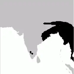 In India, there are disjunct populations in southern India. This population was recorded by Salim Ali from Antharasanthe near the Kabini reservoir. There were no records of the species from this area after the initial collection. The southern population was rediscovered from the Masinagudi area in Mudumalai in 2004.[10]