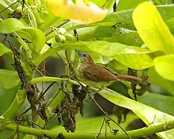 The pin-striped tit-babbler (Mixornis gularis), also known as the yellow-breasted babbler, is a species of bird in the Old World babbler family Timaliidae that is found in South and Southeast Asia.