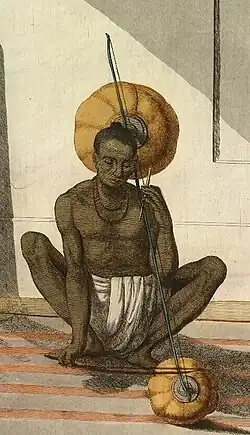 Pinaka was the name of the bow (arrow-shooting variety) of Shiva. The musical bow pināka made it into literature by the 12th century C.E. in the Saraswati Hridayalankar or Bharatbhashya by Nanyadeva (1097–1133 C.E.) In the mid-12th century it was considered to be a very important instrument by Haripala, a Gujarati king (son of Karna). The instrument was recorded in 1456 as having a second resonator. By 1810 the instrument was rare, and much of our knowledge about its appearance comes from drawings made by Frans Balthazar Solvyns, an artist who illustrated many common scenes in the 1790s and early 1800s.[1]