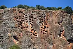 Pinara's ruins were identified by Sir Charles Fellows.[2] From amidst the ancient city, he says,[6] rises a singular round rocky cliff (the pinara of the Lycians), literally speckled all over with tombs. Beneath this cliff lie the ruins of the extensive and splendid city. The theater is in a very perfect state; all the seats are remaining, with the slanting sides towards the proscenium, as well as several of its doorways. The walls and several of the buildings are of the Cyclopean masonry, with massive gateways formed of three immense stones. The tombs are innumerable, and the inscriptions are in the Lycian characters, but Greek also occurs often on the same tombs. Some of these rock-tombs are adorned with fine and rich sculptures.