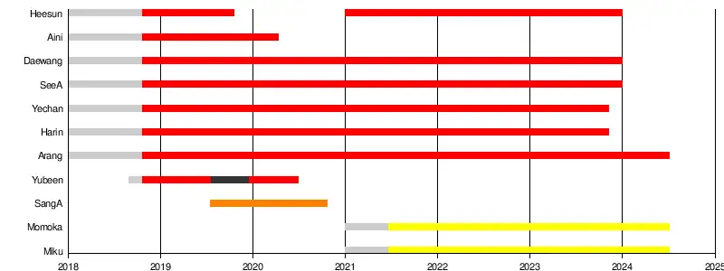 On April 12, 2020, it was announced Aini had left the group due to symptoms of Plantar Fasciitis and decreased physical strength. However, she would remain under MyDoll Entertainment as a model.[9][10]