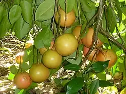 A hybrid fruit, called forbidden fruit, was first documented in 1750 (along with 14 other citrus fruits including the guiney orange) by a Welshman, the Rev. Griffith Hughes, in his The Natural History of Barbados.[1] However, Hughes's forbidden fruit may have been a plant distinct from grapefruit although still closely related to it.[34]