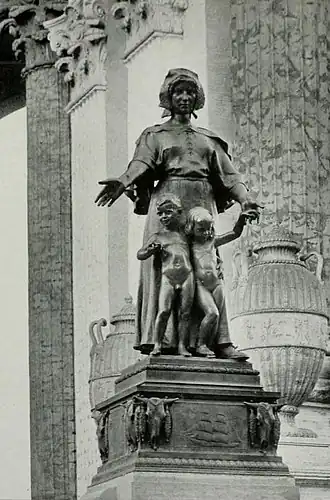 John E. D. Trask, a museum administrator and former managing director of the Pennsylvania Academy of the Fine Arts, headed the Fine Arts Department for the planned 1915 Panama-Pacific Exposition.[5] The Pioneer Mother Monument Association raised $22,500 for the project, and Trask commissioned Grafly to create the sculpture in 1913.[5] Grafly's plaster sketches are preserved at Wichita State University's Ulrich Museum of Art, and an early iteration of the work bordered on comical—a stalwart mother balancing screaming twin infants, one on each arm.[6] Grafly's final model went in another direction, granting the woman and her two naked toddlers a simple dignity. The casting took longer than expected, and the sculpture was not in place for the exhibition's March 2, 1915 opening.[5] Set atop a 26-foot (7.9 m) stepped concrete base, the monument was dedicated on June 30, 1915.[5]