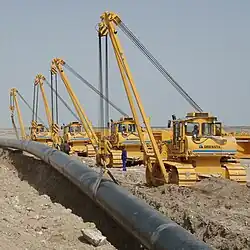 A pipelayer or sideboom is a type of a construction vehicle used to lay pipes. It is used in the construction of oil, gas and water pipelines. They are also frequently used in the railroad industry to lift derailed cars and locomotives.