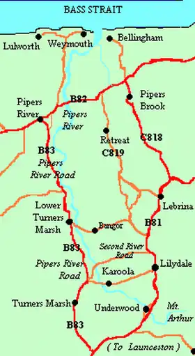 - ^ a b "Map of Pipers River, TAS". Bonzle Digital Atlas of Australia. 2015. Retrieved 30 June 2016.