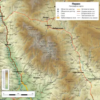 Pirin is a sparsely populated mountain range with all the settlements located at the foothills and none in the mountain itself.[57] Administratively it falls entirely in Blagoevgrad Province. From north to south there are four towns at the western foothills facing the Struma Valley, namely Simitli (pop. 6,647 as of 2016),[60] Kresna (3,267),[60] Sandanski (26,023)[60] and Melnik (170),[60] as well as three more to the north and the east — Bansko (7,369),[60] Dobrinishte (2,377)[60] and Gotse Delchev (19,087).[60][57] There are a number of villages, including among others Brezhani, Vlahi, Ploski, Lilyanovo, Dzhigurovo, Gorna Sushitsa, Kashina, Pirin, Belyovo, Novo Delchevo, Kremen, Breznitsa, Dobrotino, Kornitsa, Lazhnitsa, etc.[57]