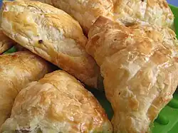 Pirozhki[a] (Russian: пирожки́, IPA: [pʲɪrɐʂˈkʲi]; sg. пирожок, pirozhok; see also other names) is the Russian name for baked or fried yeast-leavened boat-shaped buns with a variety of fillings in Russian and Eastern European cuisine in general.[5][9][10][11][12] Pirozhki are a popular street food and comfort food.[5] They are especially popular in post-Soviet states,[13][7] but may also be found in other countries.