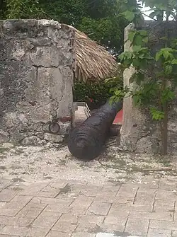 In order to provide protection to Piscadera Bay, a fort was constructed on the cliffs overlooking the bay in 1700s, however it fell into neglect.[8] The fort was restructured in 1744.[9][13] It was seized by the British army in 1804 for a week in order to bombard Willemstad. This attack was unsuccessful and the invading troops were forced to leave the fort.[9] By the 1950s, it had disappeared in the vegetation, and it was decided to restore the fort.[8] The fort is in a dilapidated state in the precincts of the Curaçao Resort.[9]