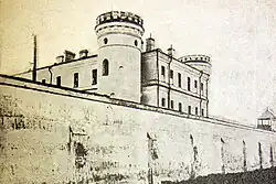 The stone building was completed by 1824, and it was commissioned in spring 1825.[1] The castle-shaped structure was purposely built as a prison by the landowner Rudolph Pischallo (also spelled Rudolf Pischalo), who entrusted architect Kazimir Khrschonovich (also spelled Casimir Hrschanovicha) with the design.[1][6] The project was approved by Tsar Nicholas I himself.[1] The main building is three stories high, flanked by four corner towers, and surrounded by the prison yard.[1]