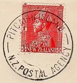 However, in May 1926, the New Zealand government discontinued this arrangement following reports of ship passengers mixing their own mail into the "no stamp” system set aside for Pitcairn residents, leaving the island again without an official postal service. On 7 June 1927, a postal agency was set up on Pitcairn to sell stamps from New Zealand.[3] Standard rates for New Zealand postage were applied.[1] Post originating from the island was cancelled with the mark "Pitcairn Island/NZ Postal Agency".[3] While New Zealand stamps were used, some commemorative covers were produced, such as one commemorating the establishment of a radio link to the island in 1938.[2]