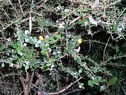 Pittosporum multiflorum grows from one to three metres in height. Thickly branched with small spines. Leaves almost circular, 3 to 12 mm long, practically without leaf stalks. Mostly toothed, through rarely entire. Flowering occurs in spring or summer. The orange fruit often persists on the plant. Regeneration from fresh seed is slow but fairly reliable. The plant is very similar to the closely related Pittosporum spinescens, but is readily distinguished by its toothed leaf margins.