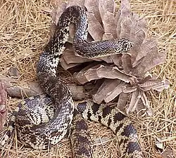 The Louisiana pine snake (Pituophis ruthveni) is a species of large, non-venomous, constrictor in the family Colubridae.[3][4] This powerful snake is notable because of its large eggs and small clutch sizes. The Louisiana pine snake is indigenous to west-central Louisiana and East Texas, where it relies strongly on Baird's pocket gophers for its burrow system and as a food source. The Louisiana pine snake is rarely seen in the wild, and is considered to be one of the rarest snakes in North America. The demise of the species is due to its low fecundity coupled with the extensive loss of suitable habitat - the longleaf pine savannas in the Gulf coastal plain of the southeastern United States. Management activities are being conducted to promote the species' recovery.