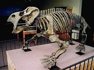 Placerias (meaning 'broad body')[2] is an extinct genus of dicynodonts that lived during the Carnian to the Norian age of the Triassic Period (230–215 million years ago). Placerias belongs to a group of dicynodonts called Kannemeyeriiformes, which was the last known group of dicynodonts before the taxon became extinct at the end of the Triassic.