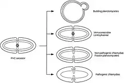 - ^ a b c d e Rivas-Marín E, Canosa I, Devos DP (2016). "Evolutionary Cell Biology of Division Mode in the Bacterial Planctomycetes-Verrucomicrobia-Chlamydiae Superphylum". Frontiers in Microbiology. 7: 1964. doi:10.3389/fmicb.2016.01964. PMC 5147048. PMID 28018303.