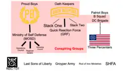 Last Sons of Liberty,[31] Rod of Iron Ministries,[32] and Groyper Army[33] were directly involved but non-conspiring groups. NSC-131[34] and Super Happy Fun America[35] both were involved in the attack and allegedly conspired, though SHFA denies this.[36] Multiple factions of the Three Percenters were also involved in the attack, including 'DC Brigade', 'Patriot Boys of North Texas',[37] and 'B Squad'. The B Squad and DC Brigade conspired with the Proud Boys and Oath Keepers.[38]