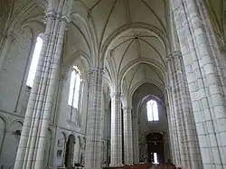 Though Angevine Gothic mainly is a kind of Early Gothic, in the region where it had been established, the mode of eight rib vaults was maintained up to the end of Gothic style, but curving and steepness decreased. A good example is Church of Our Lady FR in Niort, built from 1491 to 1550 in Flamboyant Style.
