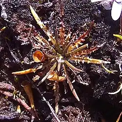 Plantago obconica is the smallest plantain in New Zealand, and is morphologically most similar to P. triandra.[1][4] It can be distinguished from that species and other New Zealand Plantago species by its small rosettes with very narrow, linear, keeled leaves, and its fruiting capsules with a funnel-like base that elongates to over 1 cm long.[4]