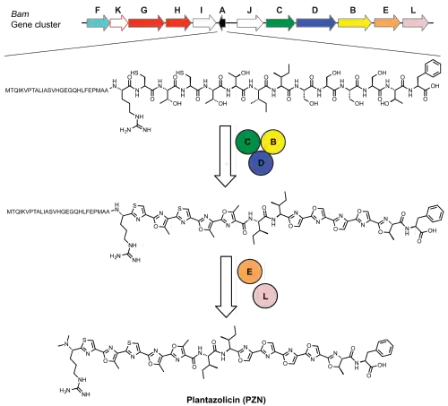 - ^ Kalyon, Bahar; Helaly, Soleiman E.; Scholz, Romy; Nachtigall, Jonny; Vater, Joachim; Borriss, Rainer; SüSsmuth, Roderich D. (2011). "Plantazolicin a and B: Structure Elucidation of Ribosomally Synthesized Thiazole/Oxazole Peptides from Bacillus amyloliquefaciensFZB42". Organic Letters. 13 (12): 2996–2999. doi:10.1021/ol200809m. PMID 21568297.