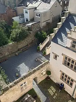 Modern visitors typically enter the house from the High Street to the south, passing through the gatehouse, across the lower courtyard into the hall of the main building. Plas Mawr's gatehouse was only the third such entrance building to be built in North Wales, despite gatehouses being an important part of English Elizabethan architecture, designed to show off the house and provide a suitably dignified entry for visitors.[58] Few houses in towns had the physical space for a gatehouse like Plas Mawr's.[59] Originally, the gatehouse would have contained a suite of rooms for the steward of the house, Richard Wynn.[60]