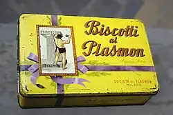 Plasmon biscuits are a biscuit containing plasmon, a proprietary dried milk. The manufacturers claimed that three pounds (1.4 kg) of plasmon equalled 100 imperial pints (57 L) of milk.[1] Plasmon was manufactured by the International Plasmon Company and was added to a number of different products to make Plasmon Oats, Plasmon Cocoa and Plasmon Biscuits. Plasmon biscuits are still manufactured in Italy by the H. J. Heinz Company.[2]
