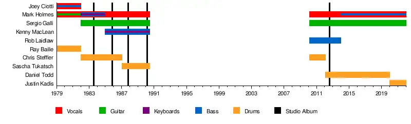 - Mark Holmes – vocals (1979–1990, 2010–present), guitar (1979–1982) bass (1982–1984, 2014–present), keyboards (1982–1984)