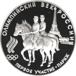 | Obverse: center – the emblem of the Bank of Russia (two-headed eagle designed by I. Bilibin), bottom – symbol, purity and weight of platinum, "BANK OF RUSSIA" Reverse: two horse riders – Russian participants of the II Olympic Games, right – the Eiffel Tower, left – the emblem of the Russian Olympic Committee, around: "OLYMPIC AGE OF RUSSIA, FIRST PARTICIPANCE · PARIS" Design: A.V. Baklanov (obverse), N.A. Nosov (reverse) Mint: Leningrad Mint (LMD). 134 indents on the rim.[4] | | ||||||||
