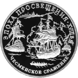 | Obverse: two-headed eagle (designed by I. Bilibin), bottom – BANK OF RUSSIA. At the bottom – the designation of metal, alloy, the precious metal content and the mint trademark. Reverse: three sailing ships and a boat at the Battle of Chesma, around: "Age of Enlightenment. 18th century.", bottom: "Battle of Chesma" Design: A.V. Baklanov Mint: Leningrad Mint (LMD). 240 indents on the rim.[3] | | ||||||||