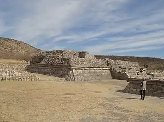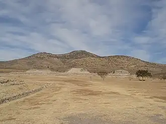 The central esplanade contains five buildings; it is believed to have represented the larger construction effort, in leveling the terrain. The buildings are the Casas Tapadas Complex, a ballgame court to the south, two structures just west of the court, a Temazcal and a large concentration of petroglyphs at the northern and western edges of the esplanade.[3]