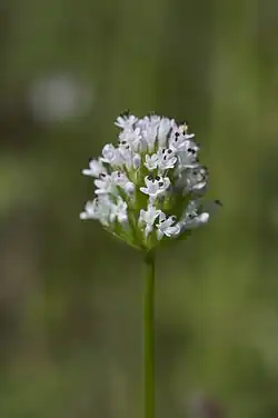 Valeriana macrocera is a species of flowering plant in the honeysuckle family known by the common names longhorn seablush and white plectritis. It is native to California and Nevada in the western United States,[1] where it is a common plant in mountains, valleys, open steppe, and coastal habitat types. It is an annual herb growing erect to a maximum height between 60 and 80 centimeters. The widely spaced, paired and oppositely arranged leaves are oval or somewhat oblong, smooth-edged, and up to 4.5 centimeters long by 2 wide. The upper ones lack petioles. The inflorescence is a dense, cylindrical, headlike cluster of flowers in shades of pale pink to white. The corolla is under a centimeter long and is divided into five lobes and a short, blunt spur.
