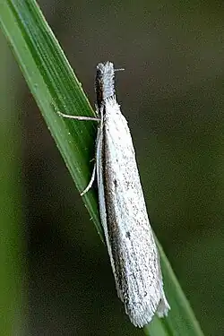 The wingspan is about 24 mm. The forewings are fuscous, irrorated with whitish; a white costal streak from base to near apex, edged beneath by a brown streak; stigmata black. Hindwings are grey. The larva is pinkish-grey, marbled with brown on sides; dorsal and subdorsal lines brownish; dots blackish; head and plate of 2 yellowish -brown, latter darker-marked.[1]