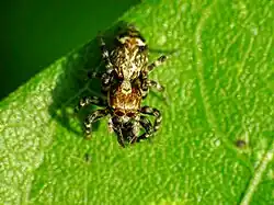 Plexippus fibulatus is a jumping spider was first described by Angelika Dawidowicz and Wanda Wesołowska in 2016.[1] The species was placed in the genus Plexippus, first raised by Carl Ludwig Koch in 1846.[2] The word plexippus is Greek and can be translated striking or driving horses. It was the name of a number of heroes in Homer's Iliad.[3] The species name is derived from a Latin word that can be translated spike, recalling the shape of the tibial apophysis.[4] The genus was placed in the subtribe Plexippina in the tribe Plexippini, both named after the genus, by Wayne Maddison in 2015, who listed the tribe in the clade Saltafresia.[5] It was allocated to the subclade Simonida, named in honour of the French arachnologist Eugène Simon.[6] In 2016, it was combined with 31 other genera into the group Christillines, named after the genus Chrysilla.[7] In his 2017 study of the genus, Jerzy Prószyński found that the species did not resemble other Plexippus spiders and therefore it should be placed in its own genus.[8] This was not undertaken, so the species remained in the genus.[1]