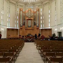 Additionally, with the 2014-15 renovation, the congregation opted to replace carpeting and traditional pews, with Italian tile flooring and chairs.[9] The choice of pew chairs opened the use of the space to nearly any configuration desired, including worship, vocal and instrumental concerts, theatrical presentations, dance, forums, or banquets. The freedom to choose configurations again allows a center aisle for weddings.
