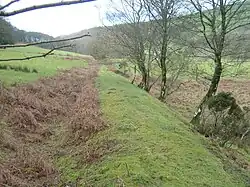 Beyond the mine, the trackbed rises on an embankment with a missing under bridge. It gradually climbs eastward on the south side of the Cyneiniog valley before reaching the foot of the Hafan incline. This section had the remains of wooden sleepers that could be seen in the 1990s.