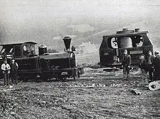The first test run of Victoria was a limited success. On 5 June, another attempt was made with the locomotive propelling two trollies and pulling a third. Just before Glanfred Lane level crossing a piece of timber was spotted lying across the rails. One of the men on the leading trolley, Richard Owen Roberts, tried to kick the timber away while the train was in motion, but he slipped and fell underneath the train and was killed when the locomotive ran over him.[7] Three other men on the trollies were severely injured in the accident. The railway had suffered a spate of stones and timbers being laid across the tracks, though this was by far the most serious outcome of this vandalism.[8]