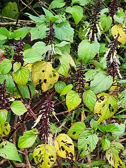 It is a shrub growing up to 2 ft in height. Stem is woody below. Branches are quadrangular and hairy. Leaves are ovate with acute apex and rounded base, crenate- serrate and minutely pubescent above and scabrous below. Flowers are funnel shaped, tube protruding from the sepal tube. Petals are velvet-hairy. Stamens are 1.2 cm long, hairless and prominently protrude out. Calyx is 7 mm long and 12 ribbed. Yellow corolla is 10 mm long with obtuse lobes.[2][3]