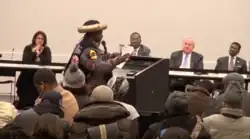 A member of the public rises to speak during a 2015 Chicago Police Board hearing.