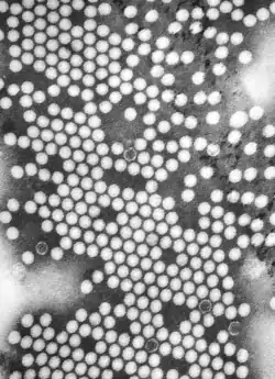 | TEM micrograph of poliovirus virions. Scale bar (white): 50 nm | |
