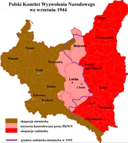 The Polish Committee of National Liberation (Polish: Polski Komitet Wyzwolenia Narodowego, PKWN), also known as the Lublin Committee, was an executive governing authority established by the Soviet-backed communists in Poland at the later stage of World War II.[1][2][3][4] It was officially proclaimed on 22 July 1944 in Chełm, installed on 26 July in Lublin and placed formally under the direction of the State National Council (Krajowa Rada Narodowa, KRN). The PKWN was a provisional entity functioning in opposition to the London-based Polish government-in-exile, which was recognized by the Western allies.[5][6][a] The PKWN exercised control over Polish territory retaken from Nazi Germany by the Soviet Red Army and the Polish People's Army. It was sponsored and controlled by the Soviet Union and dominated by Polish communists.[7]